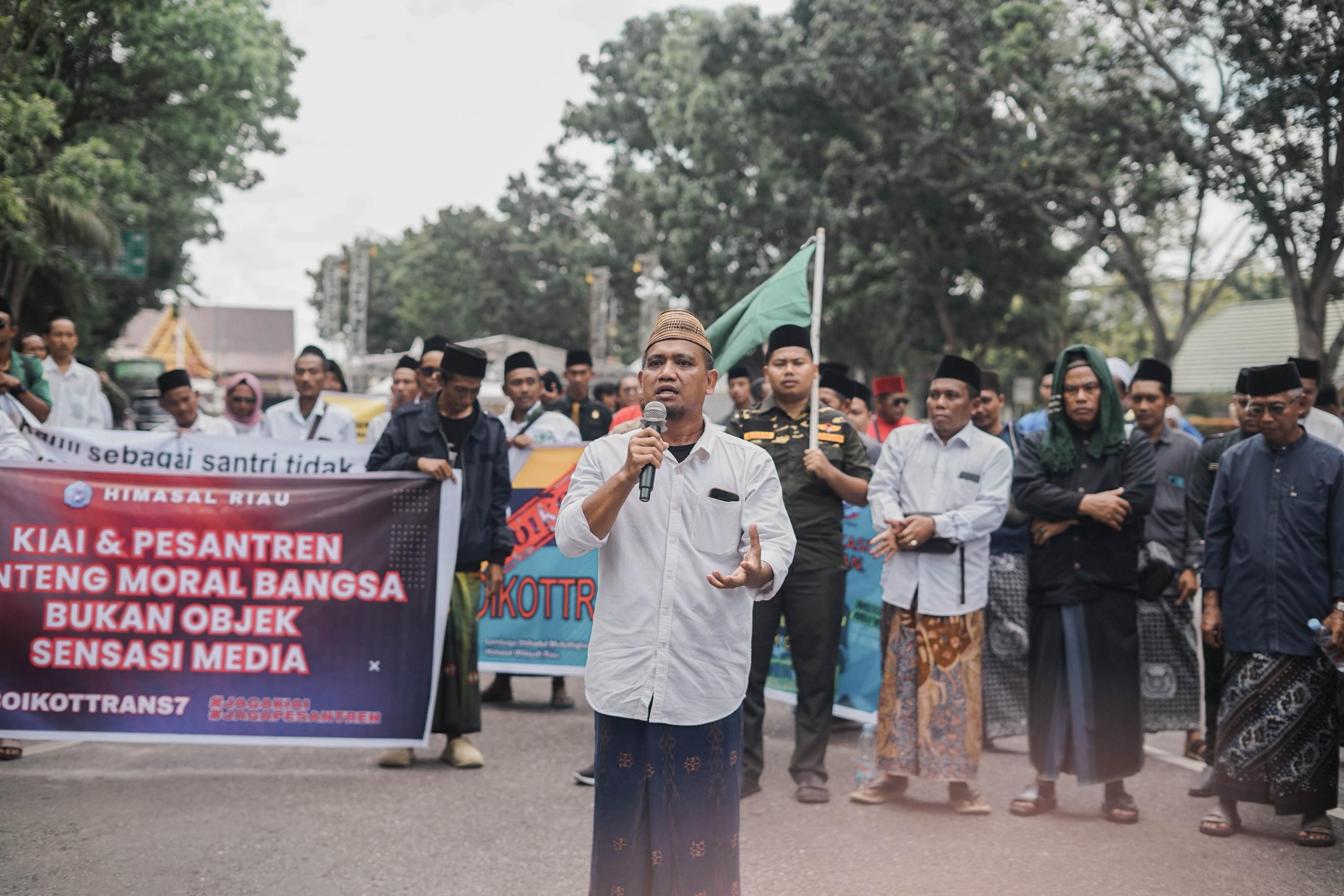 Dalam orasi utamanya, tokoh ulama Riau, Dr. Kiai Andi Sidomulyo, menyampaikan bahwa tayangan Trans7 bukan hanya kesalahan redaksional. Ia menyebutnya sebagai bagian dari “operasi hitam” yang diduga bertujuan melemahkan posisi pesantren dan ulama dalam kehidupan berbangsa.